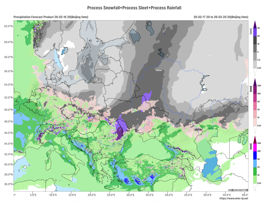 Affected by the combined influence of an upper-level trough and a low-level vortex (Figure 1), it is expected that from February 17 to 20, 2026, parts of Romania, Moldova, Ukraine, and the southwestern region of Russia will experience heavy to severe snowfall or sleet, with localized extreme snowstorms. In particular, eastern Romania and western Moldova will see exceptionally severe snowstorms. The cumulative snowfall in these areas is anticipated to range from 5 to 20 mm, with localized totals exceeding 30 mm, indicating a certain level of extremity (Figure 2). Attention should be given to the adverse impacts of the intense weather on local power infrastructure, transportation, and other industries.
