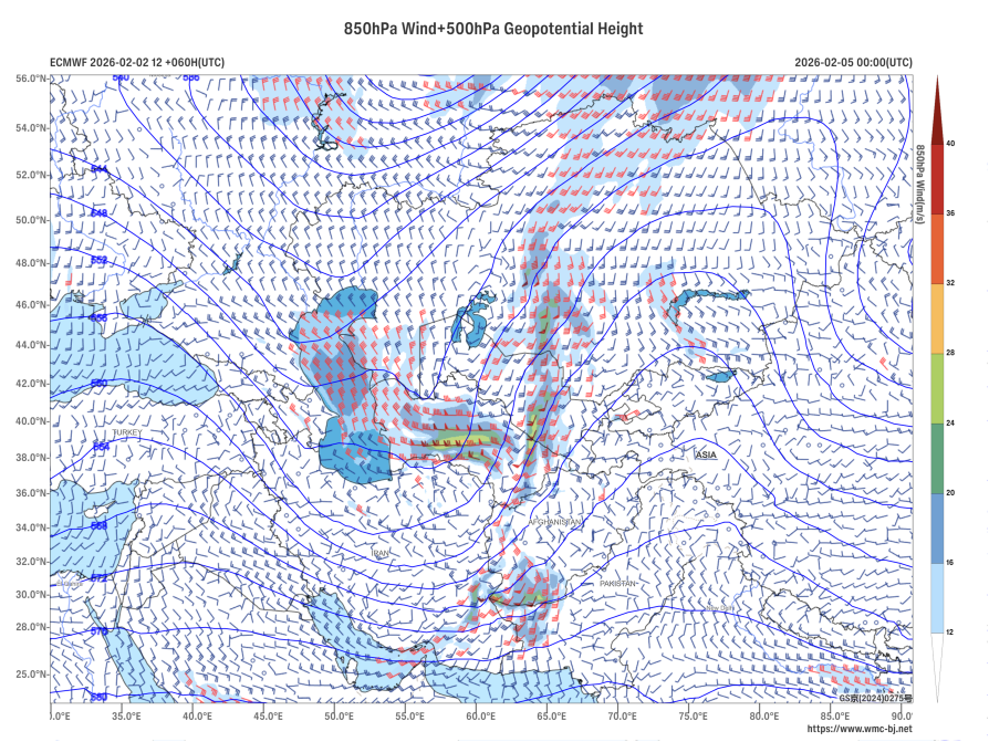 Figure 1 Forecast of 500 hPa Geopotential Height (units: dagpm) and 850 hPa Wind Field at 00:00 UTC on February 5, 2026 (units: m/s)