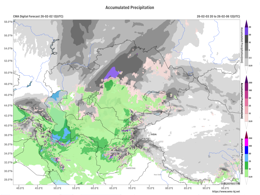 Figure 2 Forecasted Accumulated Precipitation from February 4 to 6, 2026, at 12:00 UTC (Shaded, Units: mm)