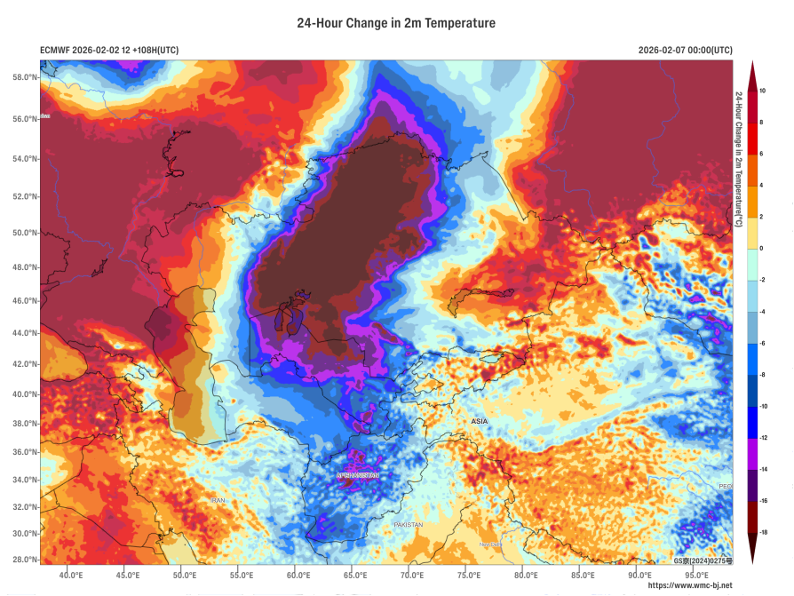 Figure 3 48-hour Temperature Change at 2 meters (Shaded, Unit: °C) as of 00:00 UTC, February 7, 2026