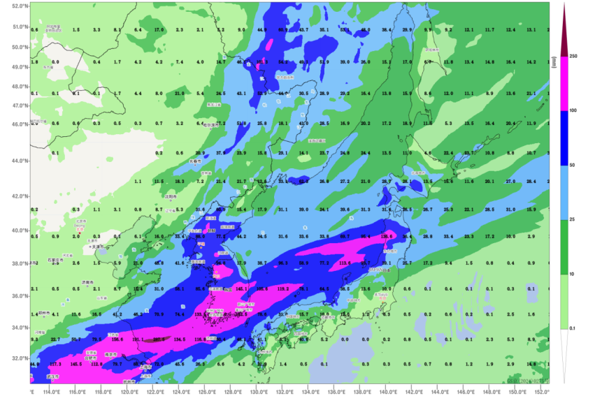 It is forecasted that over the next week, influenced by the combined effects of a northeastern cold vortex and a subtropical high (Figure 1), heavy to torrential rain will impact regions including North Korea, South Korea, the western coastal areas of Japan, the Tohoku region, Hokkaido Island, and the southern part of the Russian Far East. Specifically, parts of eastern North Pyongan Province and North Hwanghae Province in North Korea, southern South Korea and Gyeonggi Province, and western Tohoku region in Japan are expected to experience extremely heavy rain. The cumulative precipitation in these areas could reach 110-180 mm (Figure 2), accompanied by severe convective weather such as short-duration intense rainfall, thunderstorms with strong winds, and hail. The rainfall event in North Korea is anticipated from the 19th to the 21st, in South Korea and Japan from the 21st to the 24th, and in the Russian Far East from the 18th to the 22nd.