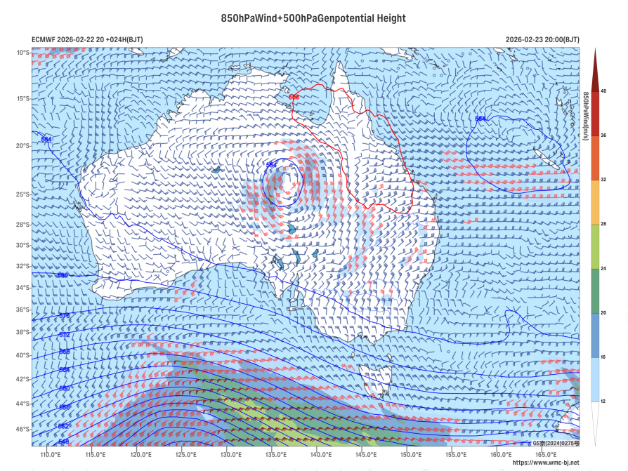 Figure 1 500 hPa Geopotential Height (units: dagpm) and 850 hPa Wind Field (units: m/s) at 20:00 (Beijing Time) on February 23, 2026