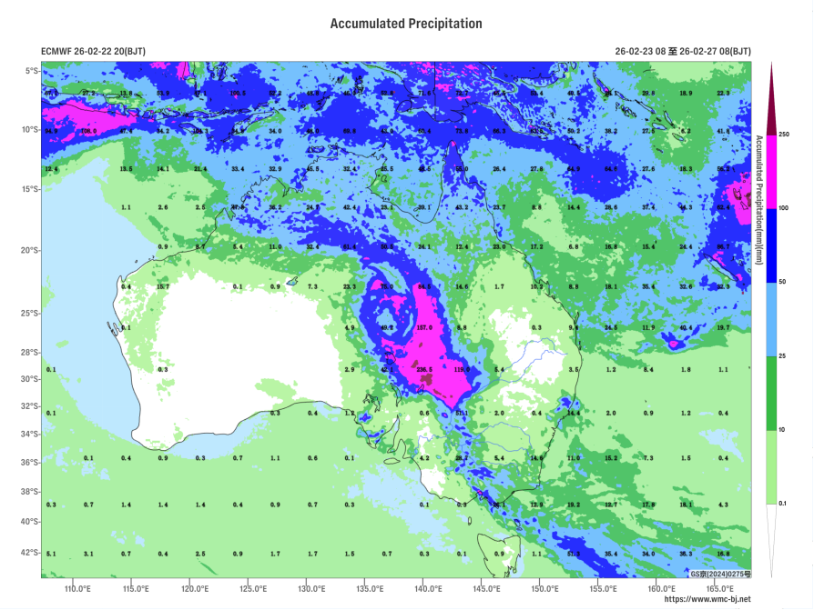 Under the combined influence of a low-pressure system and an upper-level trough (Figure 1), the central and northern region of Australia will experience persistent rainfall from February 23 to 27. Regions including northern South Australia, western New South Wales, northern Western Australia, the Northern Territory, as well as Papua New Guinea, the Solomon Islands, and the South Island of New Zealand, will experience moderate to heavy rain, with localized heavy downpours or intense rain. The cumulative rainfall in these areas is anticipated to range from 50 to 150 mm, with some areas exceeding 200 mm (Figure 2). This will be accompanied by winds of 5 to 6 on the Beaufort scale, with gusts reaching 7 to 9. Attention should be given to the potential for secondary disasters such as flash floods and urban waterlogging caused by the heavy rainfall.
