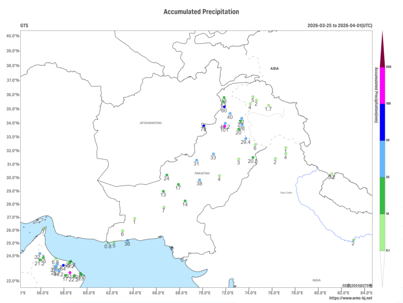Figure 1. Accumulated Precipitation from March 25 to April 1, 2026 (UTC) - Observed Data (Station-Based, Units: mm)