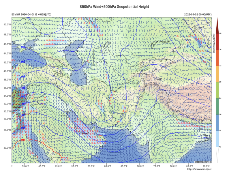 Figure 2. Forecast of 500 hPa Geopotential Height (contours, units: dagpm) and 850 hPa Wind Field (wind barbs, units: m/s) at 00:00 UTC, April 2, 2026