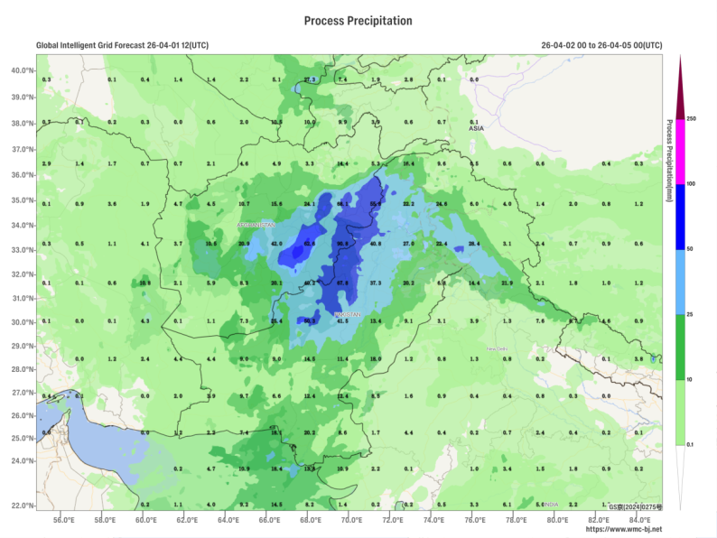 It is forecasted that from April 2 to 5, under the combined influence of an upper-level trough, a low-level warm and moist jet stream, and orographic lifting (Figure 2), moderate to heavy rain will continue in central and eastern Afghanistan and Pakistan. Eastern Afghanistan and western Pakistan are expected to experience torrential rain, while high-altitude mountainous areas will see heavy snow or rain-snow mix. The cumulative precipitation for this period is anticipated to be 20-50 mm, with some areas receiving 60-90 mm (Figure 3). Continuous attention is required for the adverse impacts of localized heavy rainfall, such as flash floods and landslides.