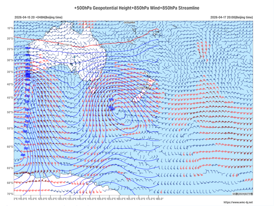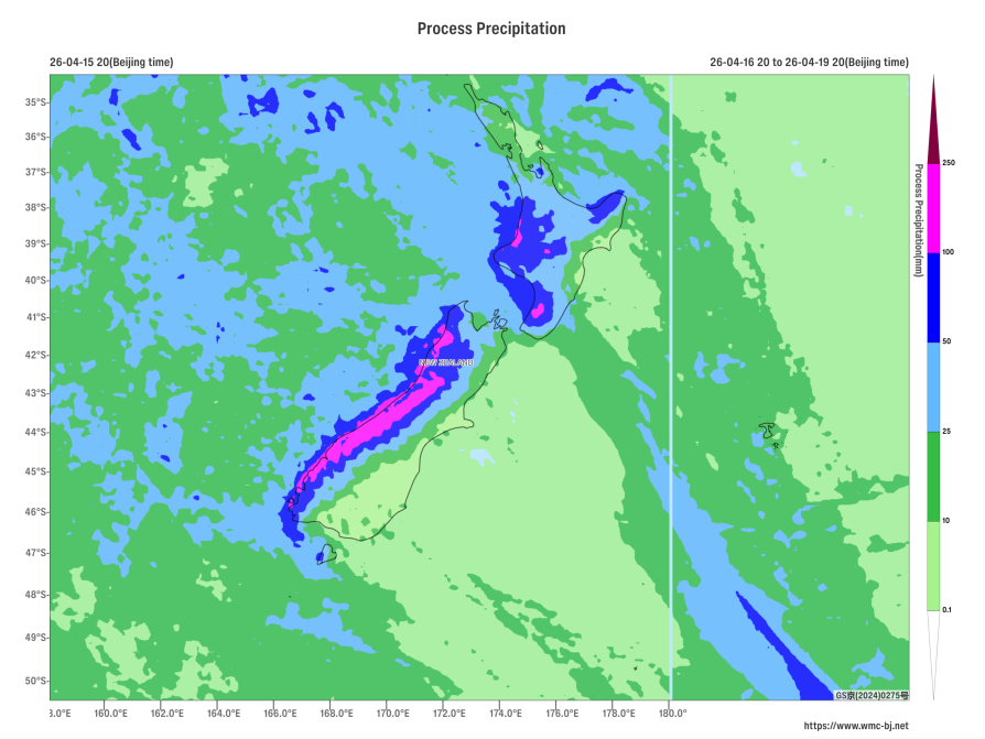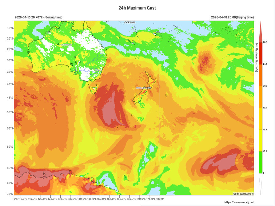 Affected by an upper-level low vortex and a low-level jet stream (Figure 1), a significant storm with heavy rain and strong winds is expected in New Zealand from April 16 to 19. The central and southern parts of the North Island and the western part of the South Island will experience heavy to torrential rain, with localized extremely heavy downpours. Accumulated precipitation in most of these areas is forecasted to be between 60 and 110 millimeters, with some localized areas potentially exceeding 140 millimeters (Figure 2). Additionally, these regions will be accompanied by strong winds of 4 to 6 on the Beaufort scale, with gusts reaching 7 to 9 (Figure 3). Attention should be given to the potential secondary disasters caused by the heavy rainfall, such as flash floods and urban waterlogging.