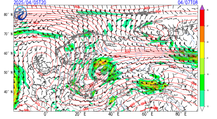 Figure 1: 500 hPa Average Geopotential Height (Contour Lines) and 850 hPa Wind Field (Wind Barbs, Shaded Areas Indicate Wind Speed) at 08:00, April 7, 2025