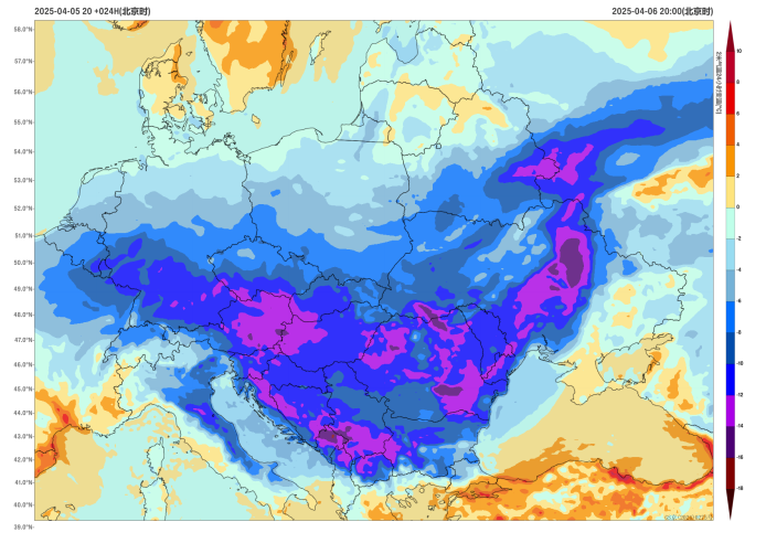 Affected by the eastward and southward movement of a cold vortex (Figure 1), it is expected that from April 6 to 7, central and eastern Europe will continue to experience strong winds, temperature drop, and heavy snow. Temperatures are anticipated to drop by 8 to 14 degrees Celsius from northern to southern part of these regions, with some areas in Ukraine, Romania, and Montenegro experiencing temperature decreases exceeding 16 degrees Celsius (Figures 2 and 3). Most of these regions will also be accompanied by winds of 4 to 6 on the Beaufort scale, with gusts reaching 7 to 9 levels, and locally, gusts could reach around 11 levels (Figure 4). Parts of western Russia, eastern Belarus, northern Ukraine, and northern Balkan Peninsula are expected to suffer blizzards (Figure 5).
