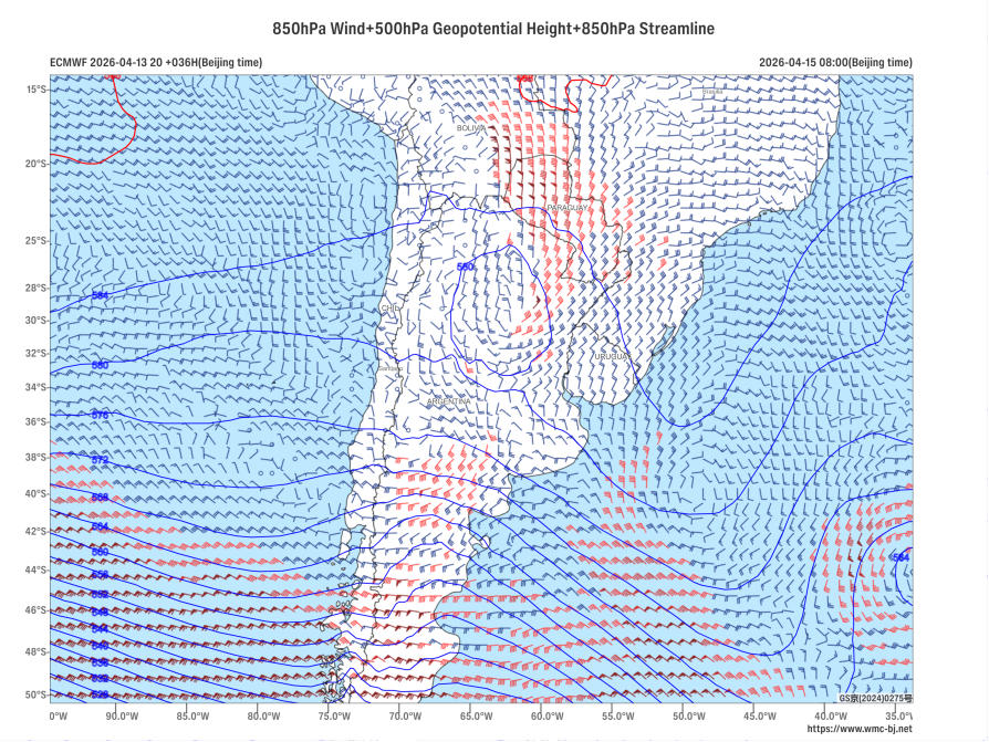 Figure 1: Forecast of 500 hPa Geopotential Height (contours, units: dagpm) and 850 hPa Wind Field (wind barbs, units: m/s) at 08:00 BJT on April 15, 2026