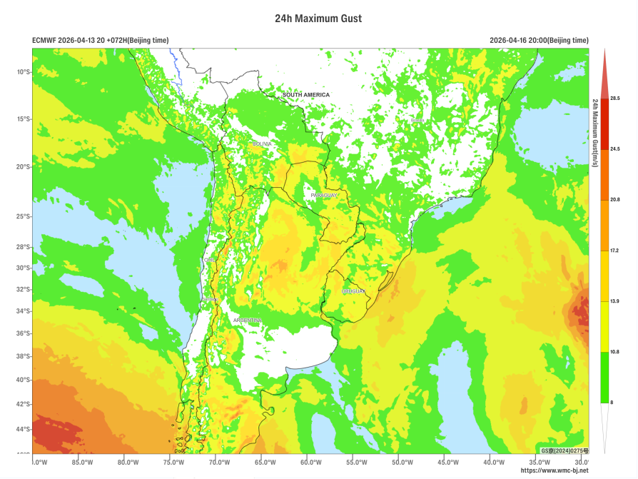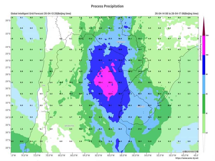 Affected by the eastward movement of an upper-level trough (Figure 1), a significant rainfall event is expected in the central and southern regions of South America from April 14 to 16. Moderate to heavy rain, with localized downpours or intense rain, will occur in northern Argentina, Paraguay, and Uruguay. In some of these areas, cumulative rainfall during this period is anticipated to be between 50 and 80 millimeters, with parts of northern Santa Fe Province and southern Chaco Province in Argentina potentially exceeding 110 millimeters (Figure 2). Additionally, some regions will experience strong winds of 4 to 6 on the Beaufort scale, with gusts exceeding 7 (Figure 3). Attention should be given to the potential secondary disasters such as flash floods and urban flooding that may result from the heavy rainfall.