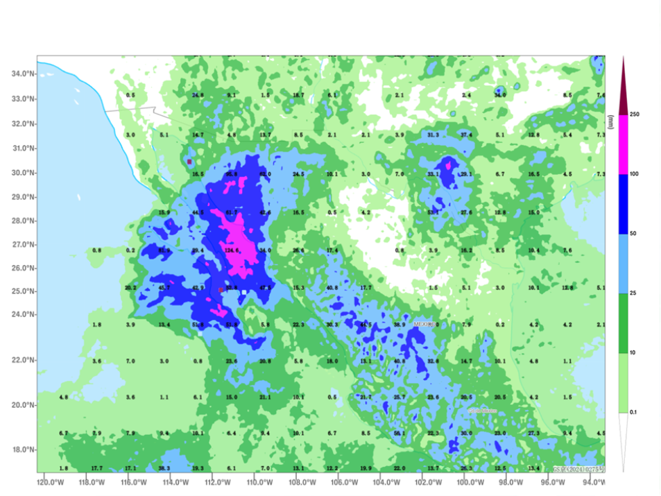 Additionally, the center of Category one hurrican "Lorena" in the northeastern Pacific Ocean was located approximately 310 kilometers west of Cabo San Lucas, Baja California Sur, Mexico, at 08:00 on the 4th, specifically at 112.9 degrees west longitude and 23.1 degrees north latitude. It is expected to move northwestward at a speed of around 25 km/h, with its intensity likely to increase slightly. As a result, moderate to heavy rain, with localized heavy downpours or intense rain, is forecasted for the northern parts of Mexico and the southern United States over the next 3-4 days. Accumulated precipitation in most areas is expected to range from 60 to 100 mm, with some parts of northwestern Mexico receiving 120 to 150 mm, and localized areas exceeding 180 mm(Figure 4). Coastal regions in northwestern Mexico and southwestern United States may experience winds of 9 to 11 on the Beaufort scale, with gusts reaching 12 to 14.