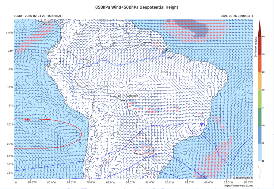 Figure 1 500 hPa Geopotential Height (units: dagpm) and 850 hPa Wind Field (units: m/s) at 08:00 (Beijing Time) on February 26, 2026
