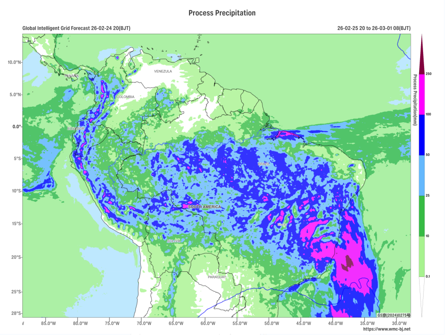 Under the combined influence of a low-pressure system and an upper-level trough (Figure 1), continuous precipitation is expected in central South America from February 25 to 28. Specifically, parts of central and northern Bolivia, central and eastern Brazil, southern Peru, western Colombia, and Ecuador will experience moderate to heavy rain, with localized areas facing torrential or extreme downpours. The cumulative rainfall in most of these regions is anticipated to be between 40-80 millimeters, with some areas receiving 100-140 millimeters, and locally exceeding 160 millimeters (Figure 2). Attention should be given to the potential secondary disasters such as flash floods and urban flooding that may result from the persistent heavy rainfall.
