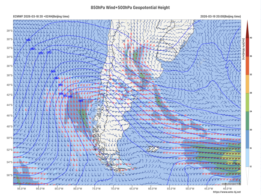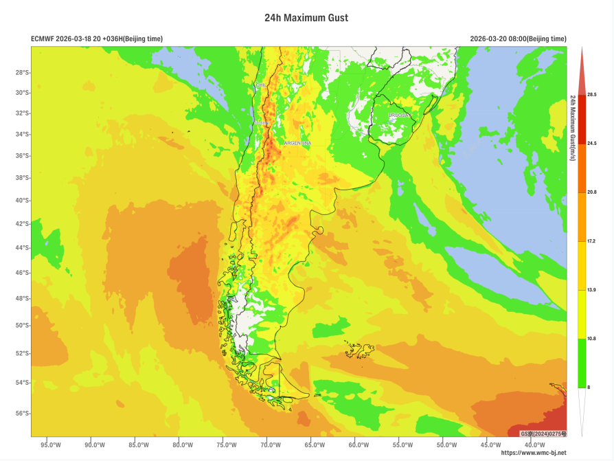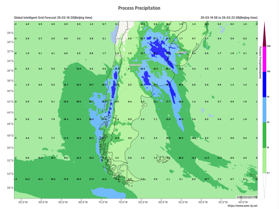 Affected by the eastward movement of an upper-level trough (Figure 1), a significant rainfall event is expected in southern South America from March 19 to 21. Countries including Argentina, Chile, and Uruguay will experience moderate to heavy rain, with localized downpours. In some of these areas, cumulative precipitation during this period is forecasted to be between 30 and 50 mm, with localized totals exceeding 80 mm (Figure 2). Additionally, parts of the region will be accompanied by strong winds of 5 to 7 on the Beaufort scale, with gusts exceeding 8 (Figure 3). Attention should be given to potential secondary disasters such as flash floods and urban flooding that may result from the heavy rainfall.