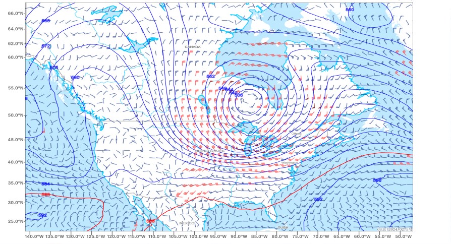 Figure 1 500 hPa Geopotential Height (Isopleths) and 850 hPa Wind Field (Wind Barbs) at 12:00 UTC on September 5, 2025
