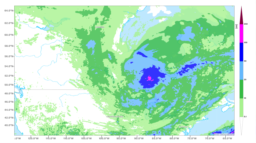 Affected by the eastward movement of a cold vortex (Figure 1), moderate to heavy rain, with localized downpours, is expected from today through the 6th in southern and eastern Canada, as well as northeastern United States. Higher elevations will experience light to moderate snow or sleet. The cumulative precipitation during this period is anticipated to reach 40-80 mm, with localized areas exceeding 110 mm (Figure 2).