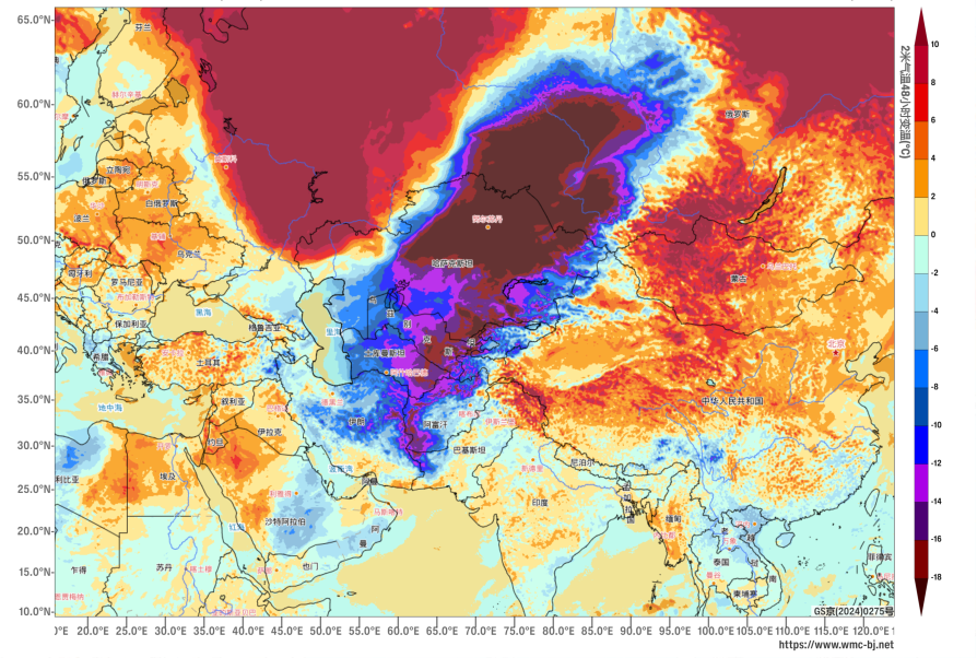 Affected by a strong cold air mass (Figure 1), it is expected that from March 9 to 11, most of Central Asia will experience a temperature drop of 6 to 10°C, with localized areas seeing a drop of over 14°C (Figure 2). Some regions will be accompanied by winds of 5 to 6 on the Beaufort scale, with gusts exceeding 8. In Tajikistan, Kyrgyzstan, and the southeastern part of Kazakhstan, among other areas, moderate to heavy snow or sleet is anticipated, with localized heavy snowfall or blizzards (Figure 3). The cumulative precipitation in these regions is expected to be between 15 and 30 mm, with some local areas receiving over 40 mm. Attention should be paid to the adverse impacts of gusty winds, temperature drops, rain and snow on transportation and travel.