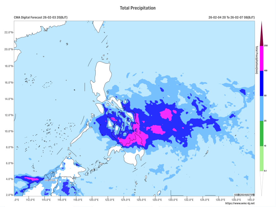 Fig. 1 Forecast of Accumulated Precipitation from 00:00 UTC on 4 Feb to 00:00 UTC on 7 Feb 2026 (Color-Filled, Unit: mm).